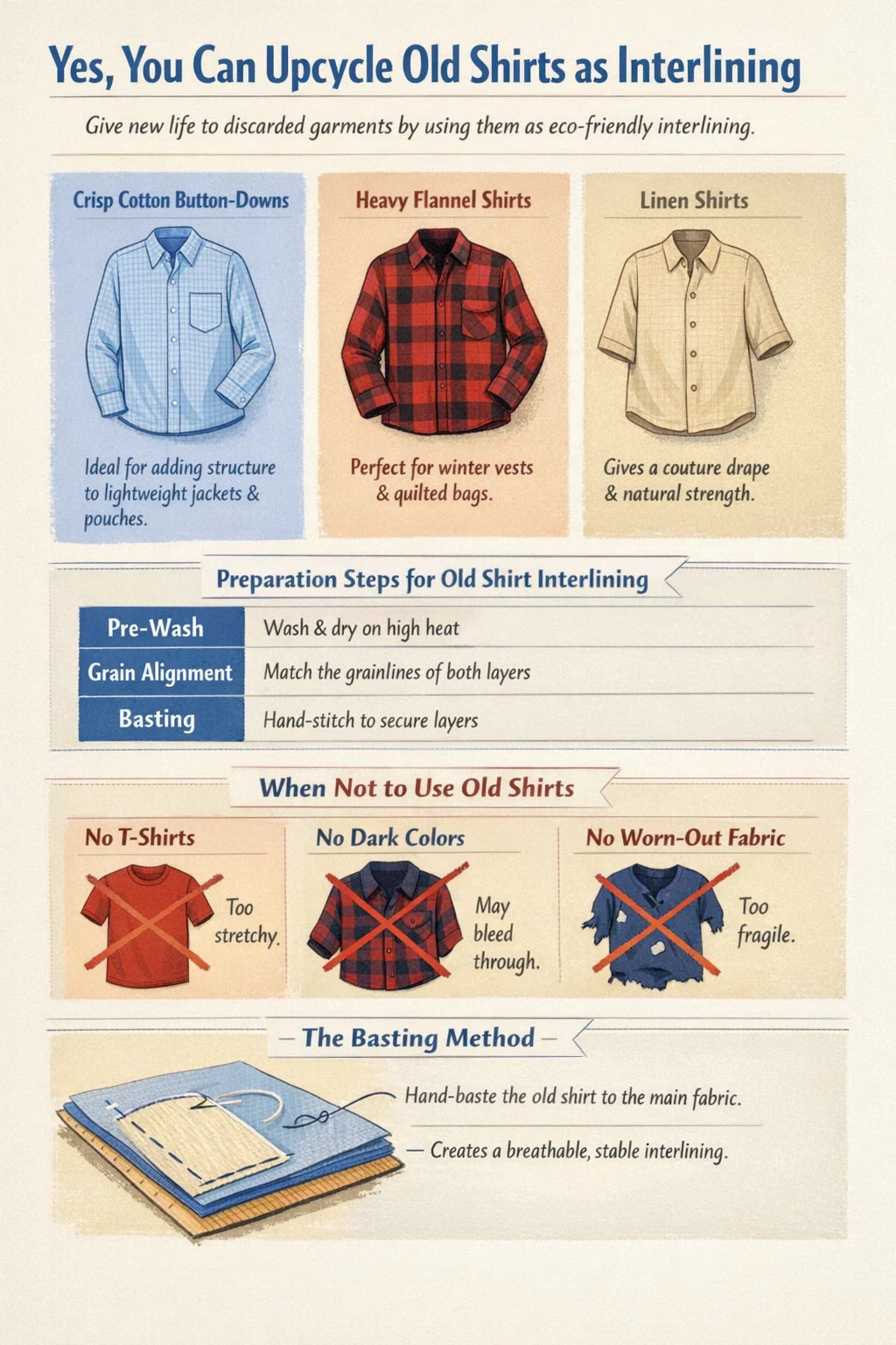 Brevis responsio est resonante sic . Tunicae antiquae vel insuetae fieri possunt ut optima, eco-amica, et cost-effectiva interlining pro variis sutura inceptis. Usus abiectis vestibus ut internus iacuit traditio longa est in scissoris, quae "faciens facere." Attamen successus omnino pendet ex congruens proprietatibus materialibus tunicae - sicut fibra eius contenta, texere et pondus - ad necessitates novi propositi tui. Cum recte factum est, vetus xylinum vel tunica flannella corpori necessaria, stabilitatem, et calorem sine synthetica necessitate praebet, horrea stabilimenta emuntur.