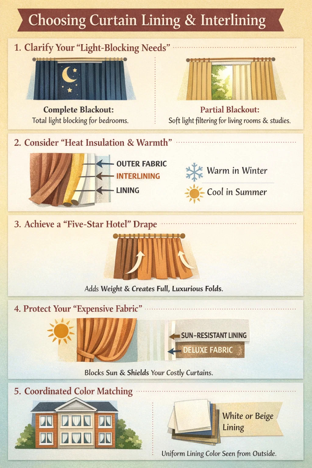 Tunicam immola: Eligens tunica solis resistens sicut "scutum" efficaciter potest dilatare spatium operis principalis exterioris. Praesidium multi-circulum: Si subtilissimas telas ut sericum emeres, interlinamentum etiam quiddam agere potest, quo minus fabricae a sole directo laedantur.