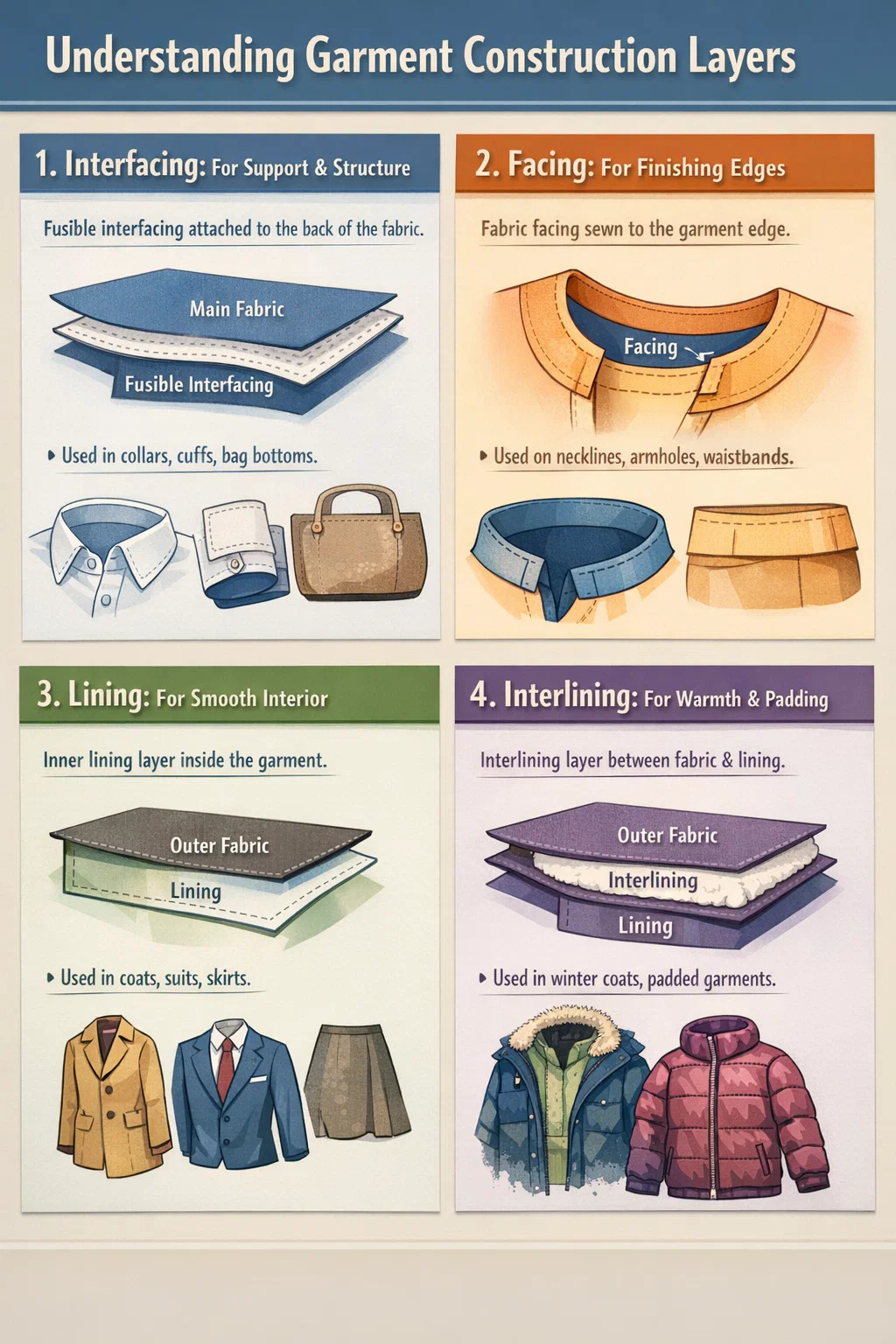 Uti: Solet dorsum adhaerere fabricae principalis. Typus frequentissimus nunc est "fusibilis interfacing", ubi simpliciter latus contra fabricam tenaces pones et illud ferreo comprimas, et textura constringit.