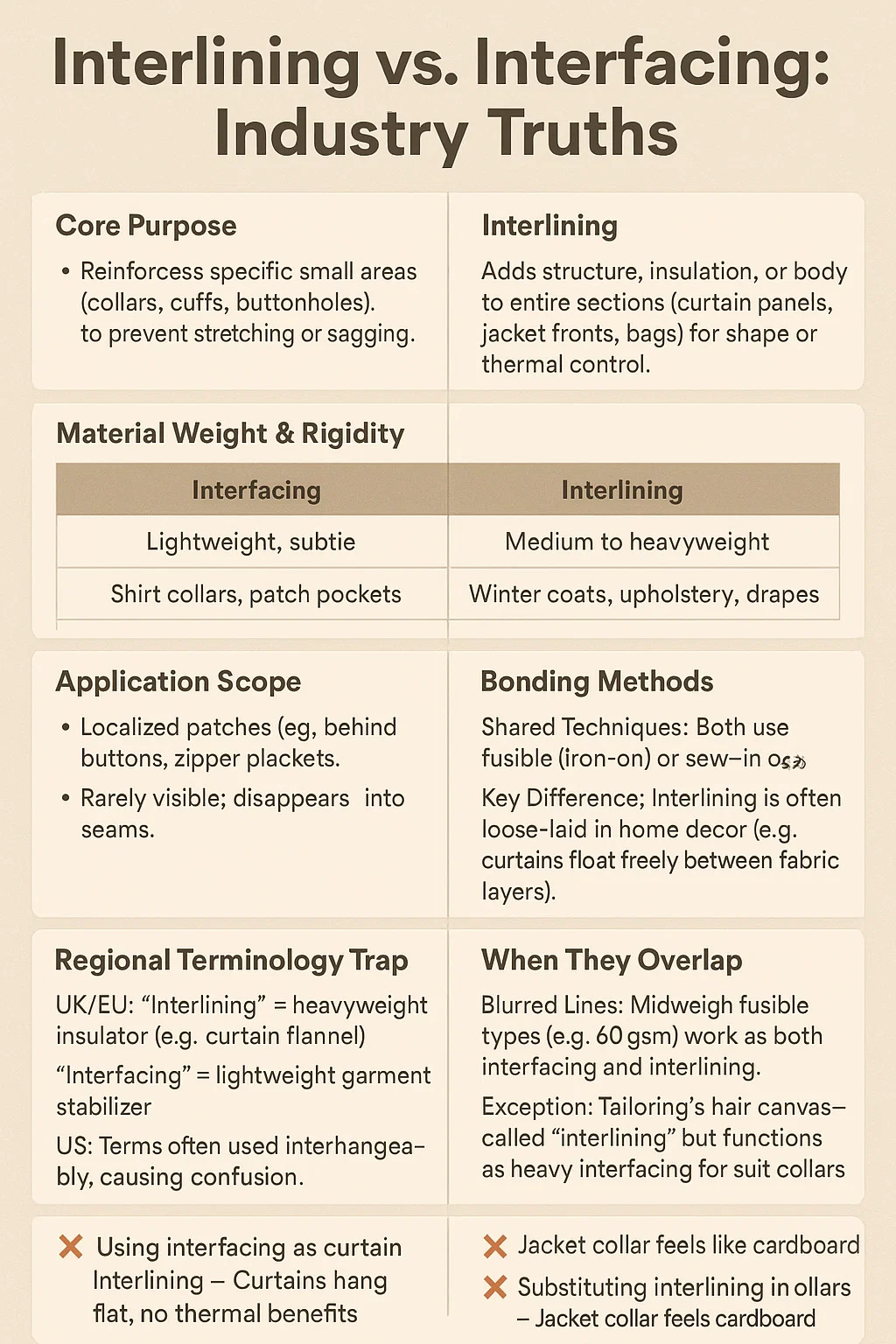 UK / EU: "Interlining" = heavyweight insulator (E.G., Flannel). "Interfacing" = Lightweight vestis stabilitor.
