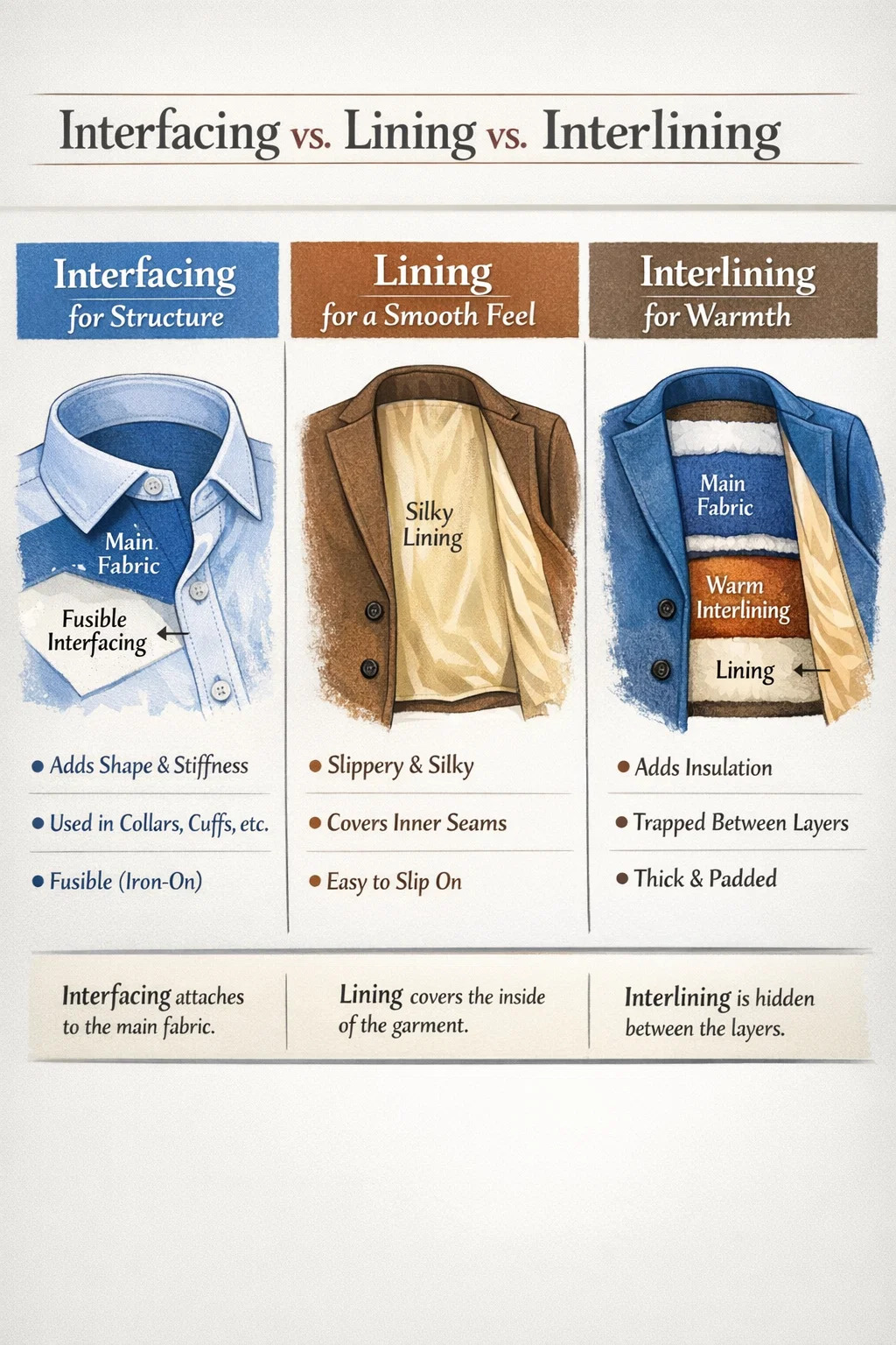 In vestimento faciendo, interfacing, oblinit interlining sunt quasi tres heroes operandi post scenas. Singulae partes distincte agit in fabricam limpam mutandi in vestem structam, calidam et commodam confectam.