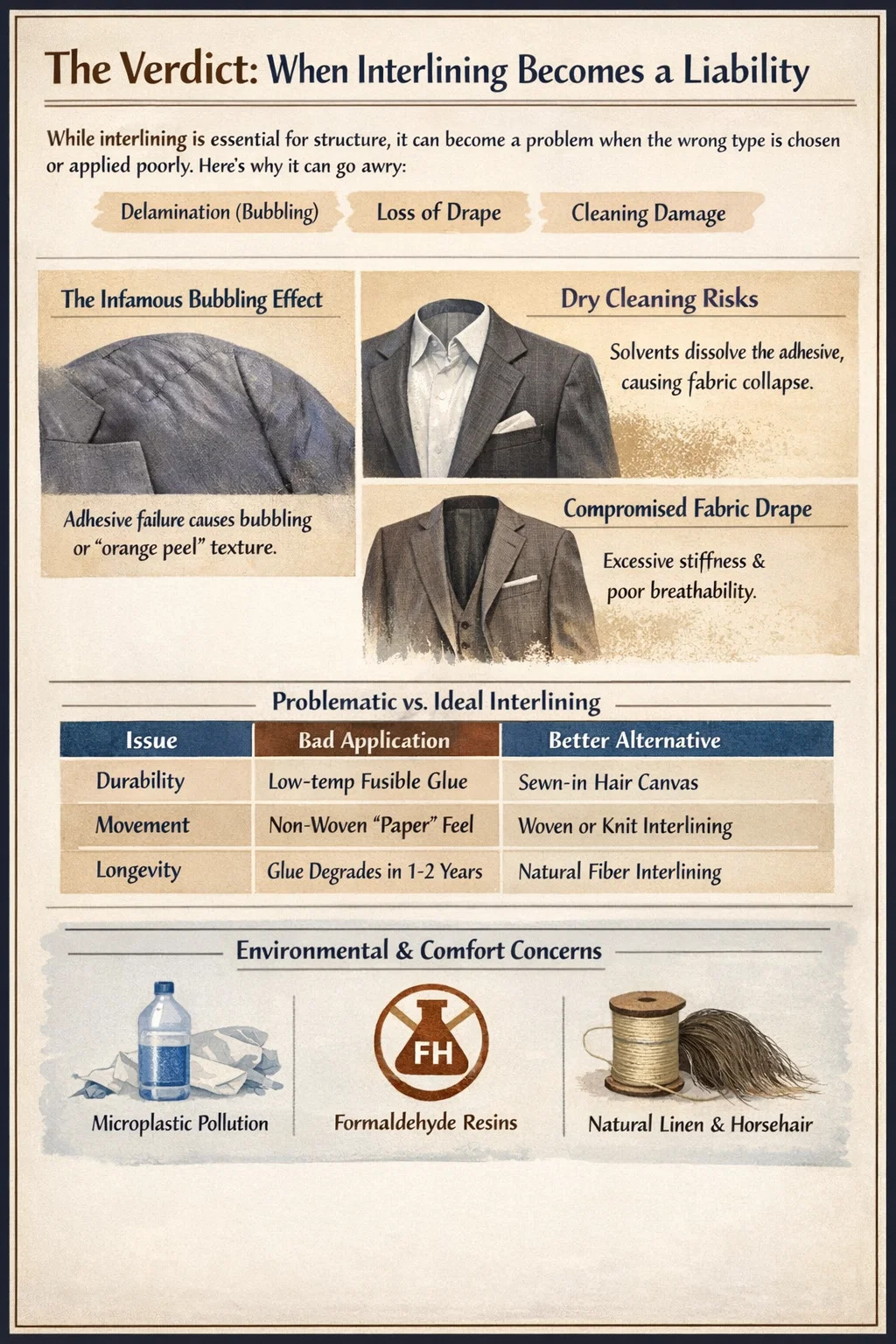 Patet esse; interlining non secundum se malum ; immo de ratione structurae. Sed fit "malus" cum eligitur malum genus vel cum male applicatur. Causae primariae peculiares interlinationes considerari possent detrimentum vestimenti delaminatio (bubbling) , a amissio naturalis drape et adversis quemadmodum purgatio . Cum vinculum inter interliningam et machinam defecerit, permanentem aestheticum detrimentum creat, quod mutari non potest.